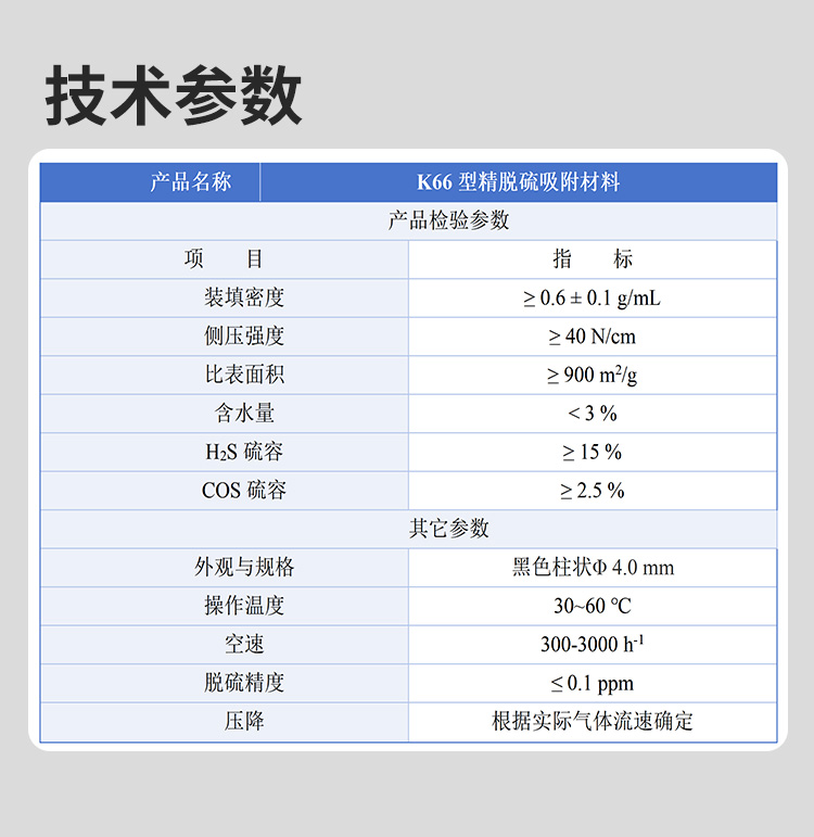 二、K66型精脱硫吸附材料技术参数