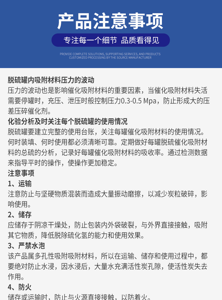 该产品属多孔性吸附吸附材料,所以在运输、储存和使用过程中,都要绝对防止水浸,因水浸后,大量水充满活性炭孔隙,使活性炭失去作用。