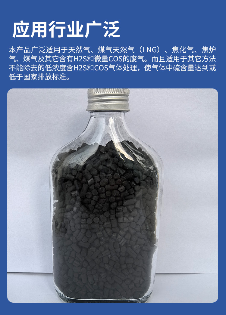 本产品广泛适用于天然气、煤气天然气(LNG)、焦化气、焦炉气、煤气及其它含有H2S和微量COS的废气。而且适用于其它方法不能除去的低浓度含H2S和COS气体处理,使气体中硫含量达到或低于国家排放标准。